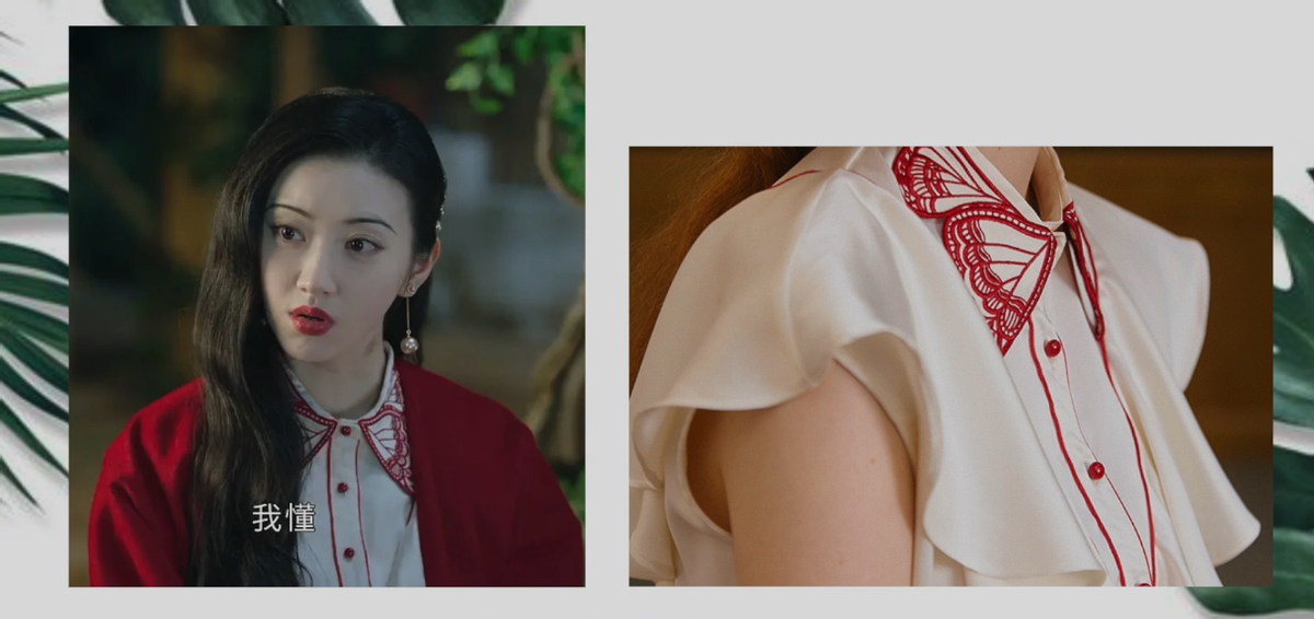 第一个look,是一个蝴蝶领刺绣的无袖衬衫,侧边是荷叶边的设计,来自一个原创的复古风品牌咖沫,这个品牌的设计有很多艺术元素的融入,而且价格也的亲民,像景甜在剧里面的这件价格是229人民币,说实话比很多快时尚都要便宜。