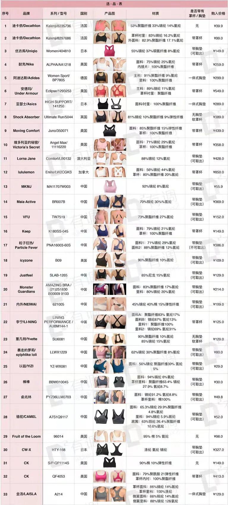调研报告里面有33种内衣的面料成分,基本上是锦纶+氨纶(LULULEMON用的是杜邦公司的氨纶纤维,即莱卡)