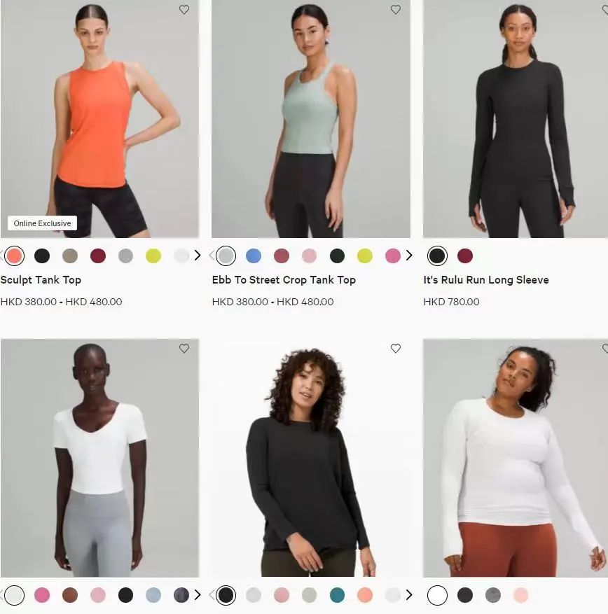 上面图片是从LORNA JANE和LULULEMON官网找的,颜色挺丰富的,挺亮的。之前还流行过荧光色的瑜伽款。