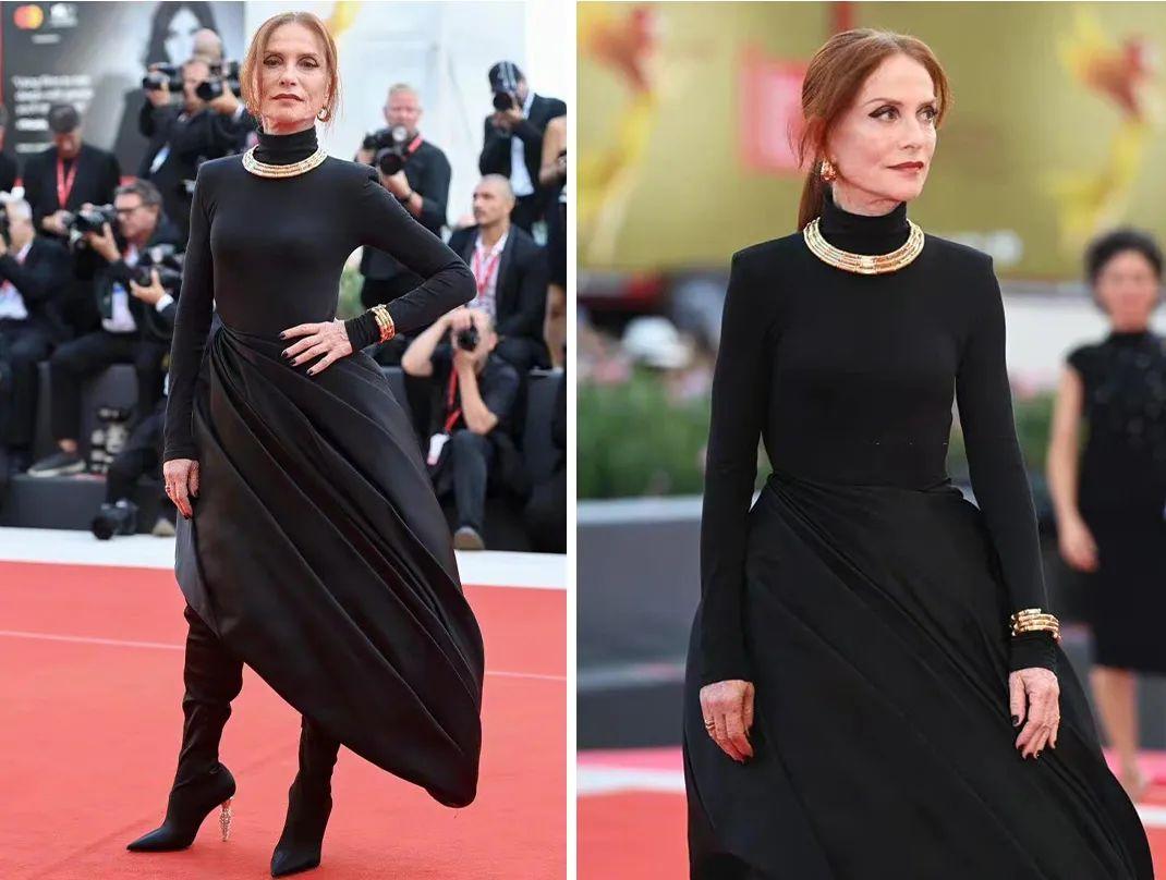 伊莎贝尔·于佩尔则把极简风演绎到了,黑色裙装来自阿玛尼2007高定系列。搭配金色造型感珠宝,经典黑金搭配,简简单单却让人挪不开眼。