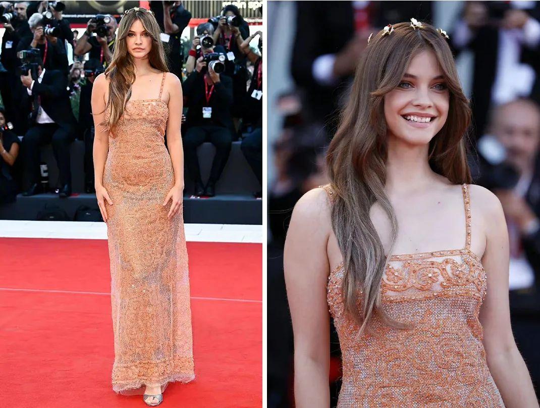不过比起各种高饱和色彩的礼服,更多女明星还是选择了淡色系的衣着。像芭芭拉·帕尔文第二套就穿的一件淡橘色刺绣裙装,搭配花朵头饰,妥妥的花仙子。
