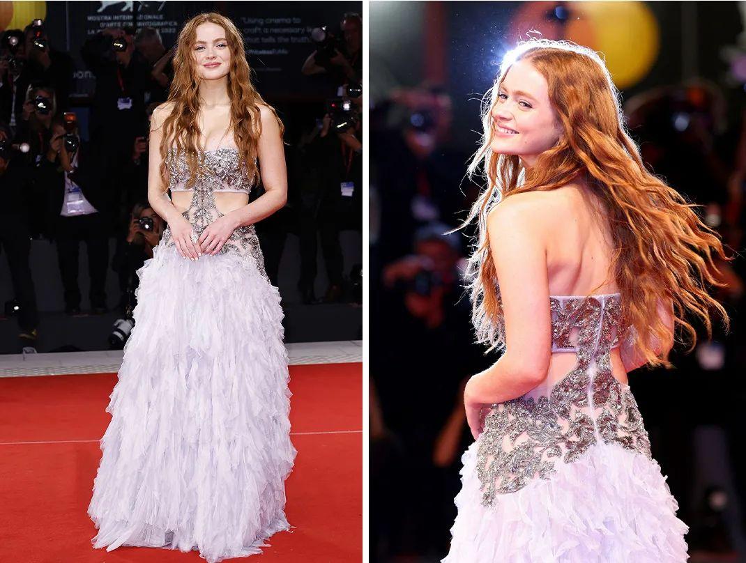 出演过《怪奇物语》的女演员Sadie Sink这身裸色look颇受好评。裙子来自麦昆,雪纺裙摆轻盈灵动,搭配棕色长卷发,很有森林精灵的调调~