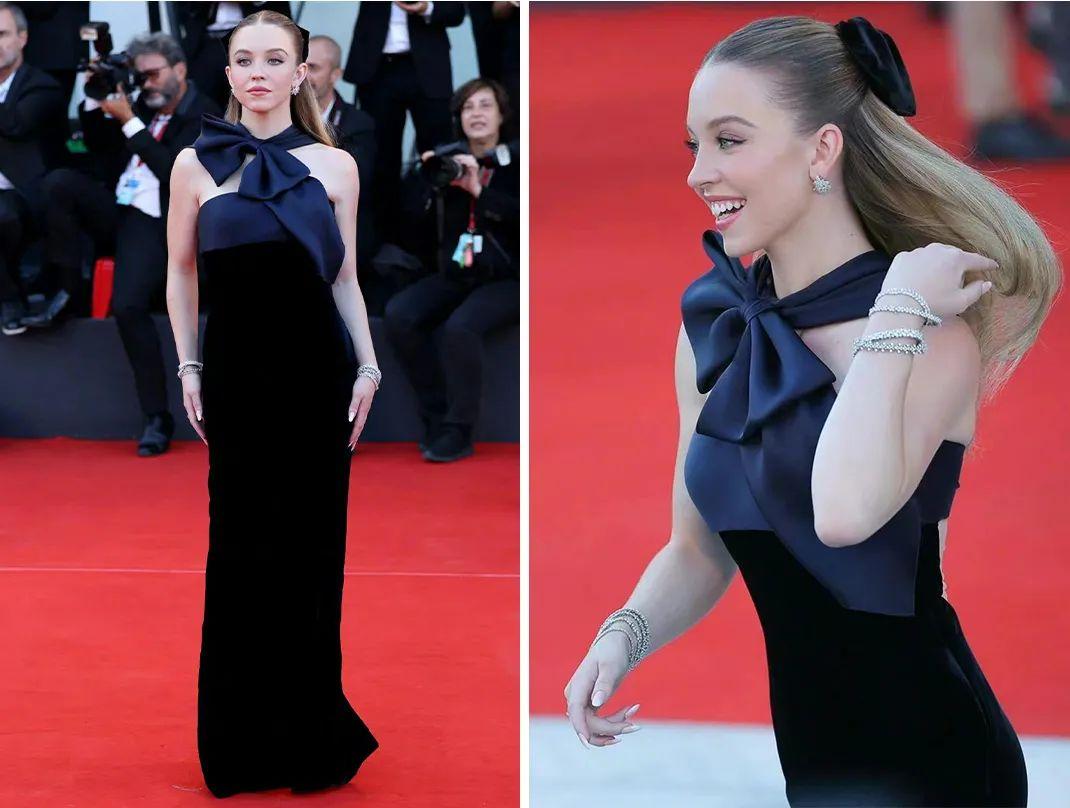 因为出演《亢奋》爆红的Sydney Sweeney,则把黑裙演绎出了甜美气质。她选择了一条黑蓝搭配的阿玛尼高定系列裙装,领口处的蝴蝶结很可爱~