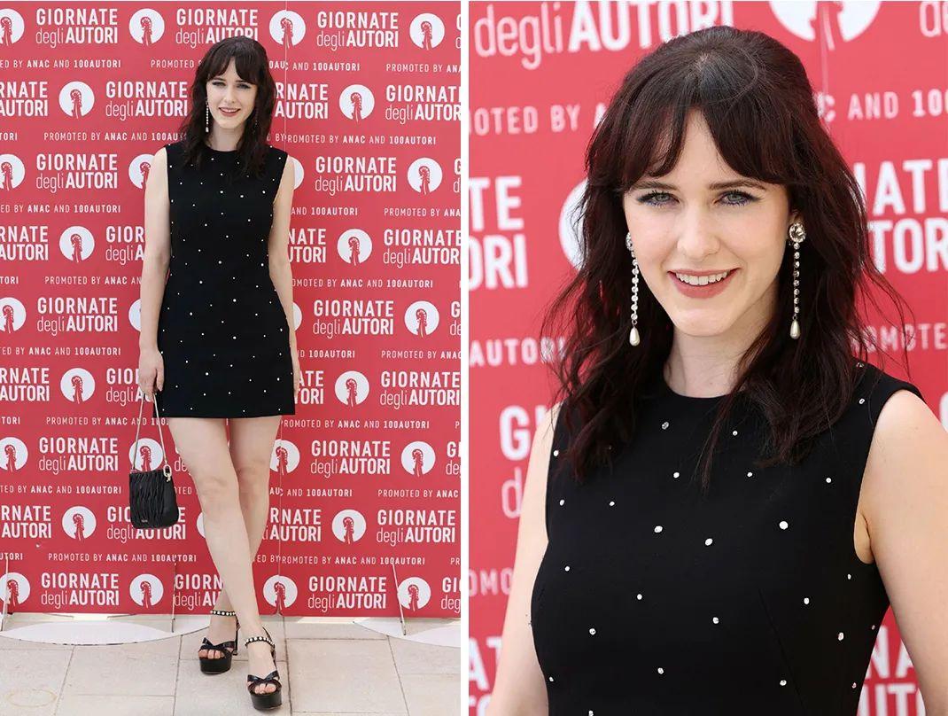 麦瑟尔夫人Rachel Brosnahan的这条MIUMIU小黑裙设计就比较日常风了,感觉平时约个会什么的也能穿。