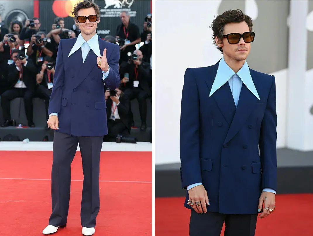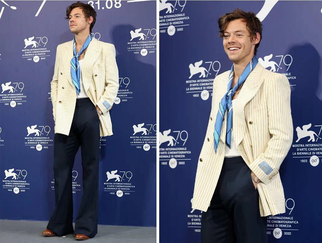哈卷还有另外一套条纹西装搭配喇叭裤的look,丝巾点缀还挺有松弛感。全部单品也都是Gucci男装。
