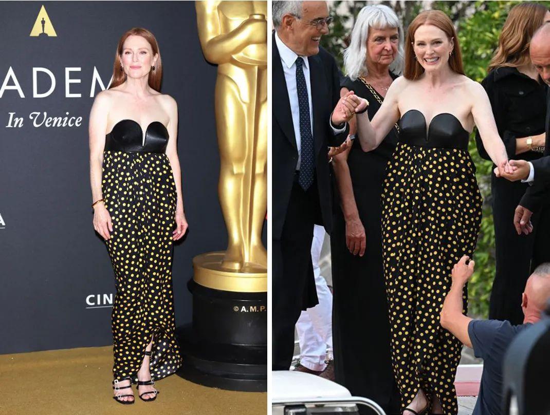 朱利安·摩尔还上身了一条设计师品牌Alaia的黑色波点抹胸裙。立体胸衣+下摆茧型剪裁,风格比较俏皮,不过就是密恐患者需要避雷~
