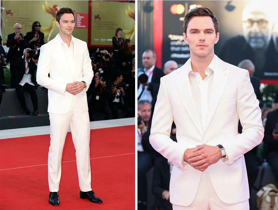 尼古拉斯·霍尔特依然绅士。一身白色西服套装干净耐看,搭配一枚积家翻转方表,简单显品。