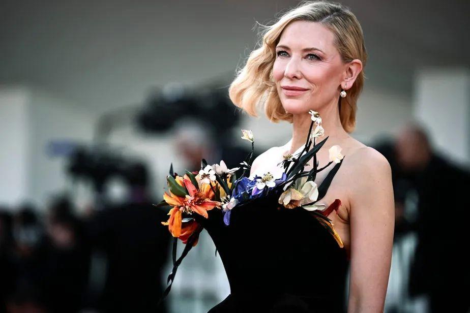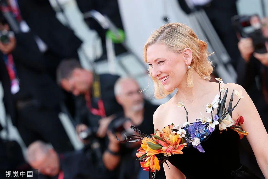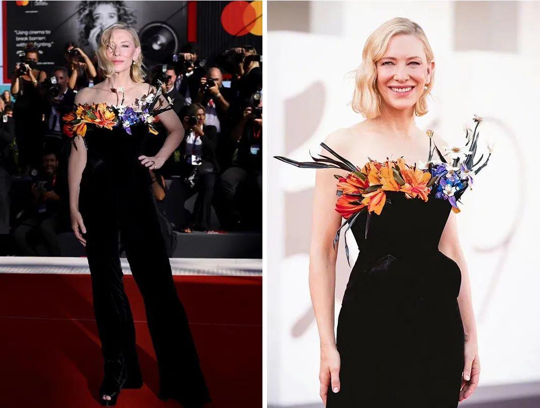 有人走“黑上添花”路线,许久不见的“大魔王”凯特·布兰切特就靠这一招惊艳了全场,身穿黑色花朵套装来自Schiaparelli 2022高定,“胸口生花”的设计确实很绝。