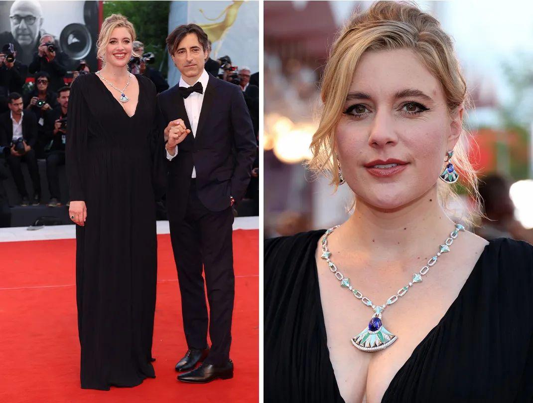 Greta Gerwig同样采用了简洁黑裙衬托高级珠宝的思路。这一条全黑裙装来自Gucci,简单。搭配的宝格丽高珠却很吸睛,全新的奇境伊甸园系列,有种彩宝开会的感觉。