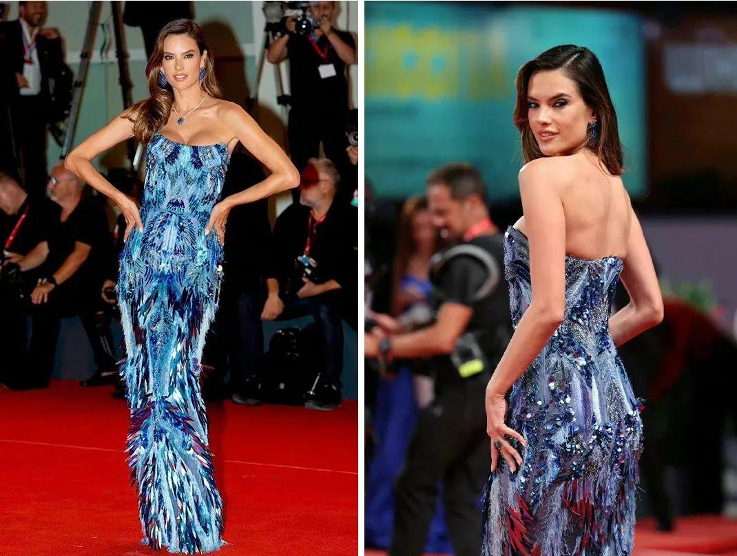 她的另一个装扮选择了一条来自Alberta Ferretti的蓝色流苏抹胸裙,裙身的彩色羽毛点缀很满满的动物感,同时搭配的蓝色珠宝整体统一性很高~