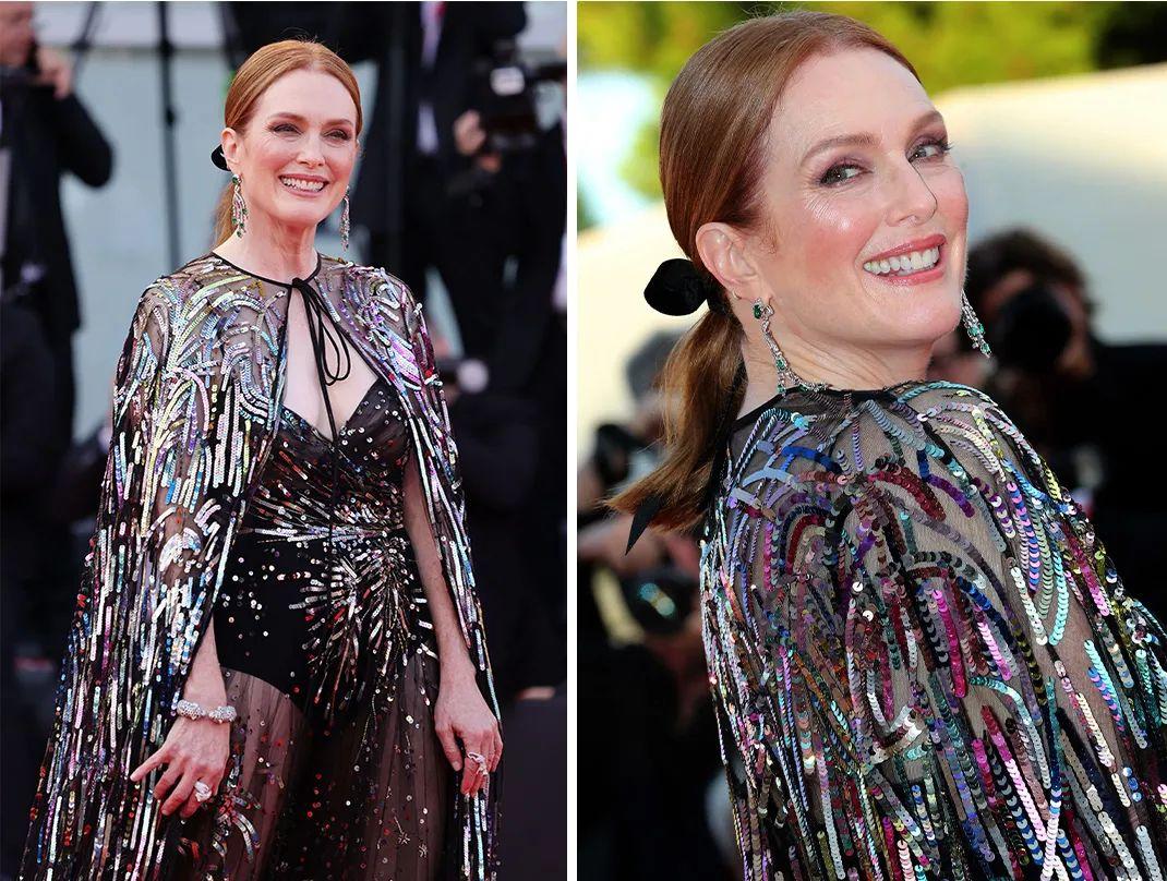这届红毯,很多女星都穿得blingbling。朱利安·摩尔第一次露面就上身一款黑色Valentino高定纱裙,有点蝉翼的感觉,透视设计风格还蛮大胆的。