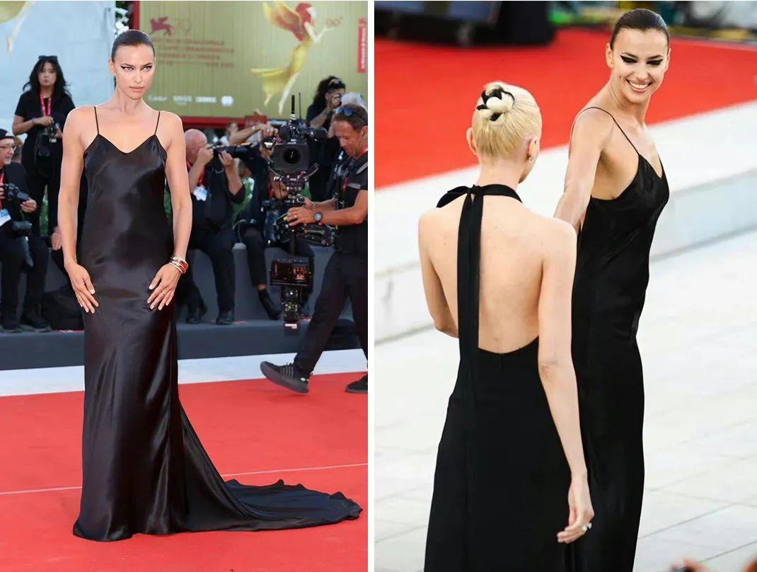 和Stella一起走红毯的,还有大家的C罗侃爷前女友Irina Shayk。这次她轻装上阵,身穿一条设计简单的Pinko黑色丝绸吊带裙搭配金色手镯,气场也很足。