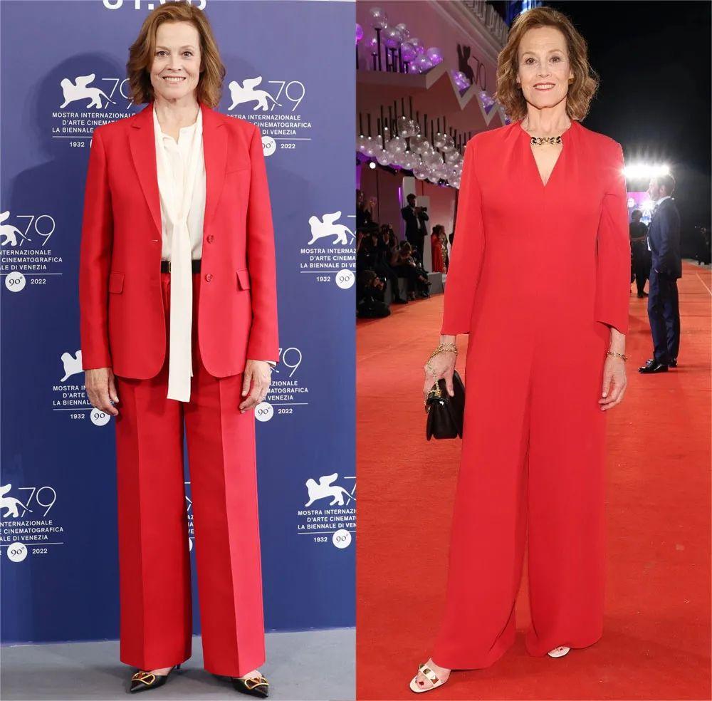 另一位老戏骨、《异形》女主西格妮·韦弗,同样是一身Valentino红亮相,气场不减。