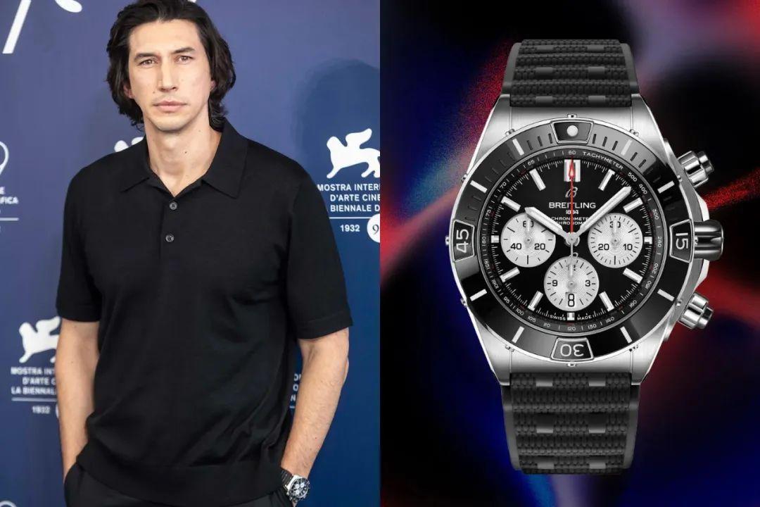“司机”Adam Driver也是比较轻装上阵,穿个基础款POLO就来了,搭配一块百年灵运动腕表,很显男人味。