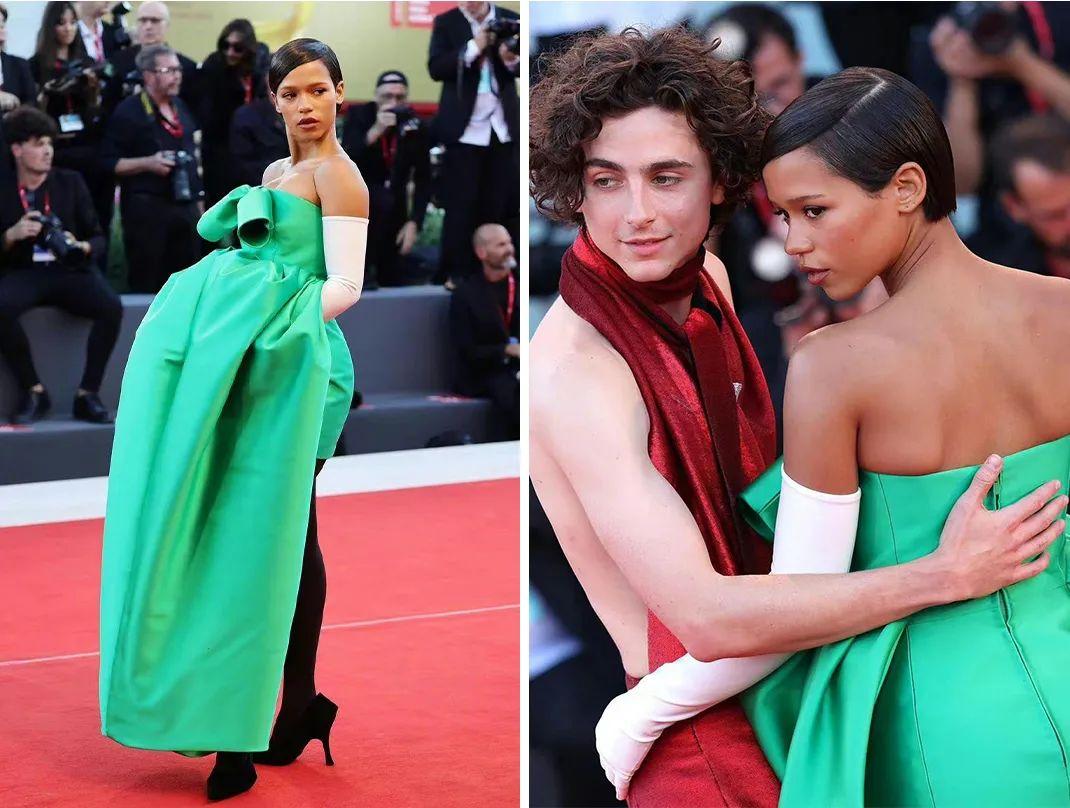 《Bones And All》的女主角Taylor Russell,身穿绿色巴黎世家高定系列抹胸裙,时髦吸睛。还和甜茶组成本次威尼斯红毯上的红绿双煞~