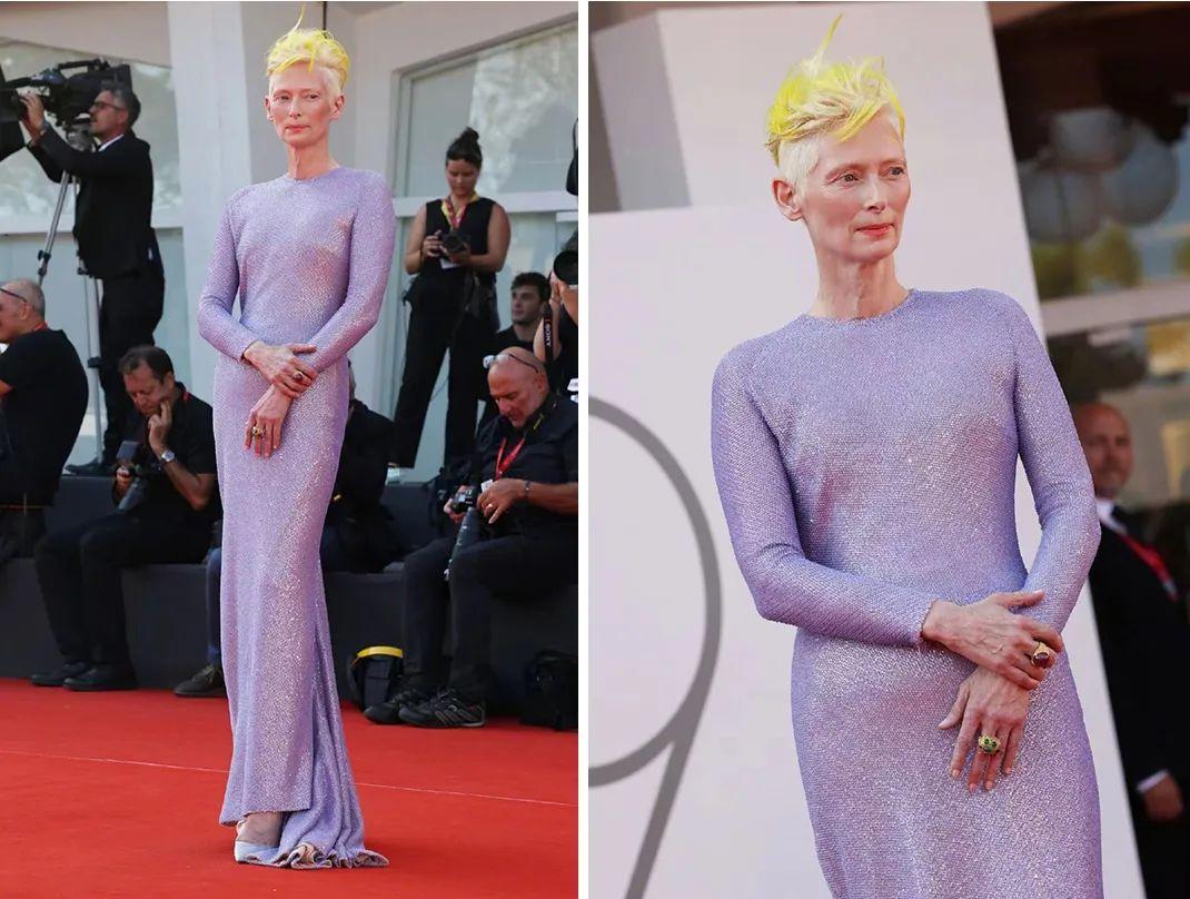 蒂尔达斯文顿的这条Haider Ackermann淡紫长裙搭配明黄色头发的造型也亮了~如此清奇的画风,感觉只有她能hold住。