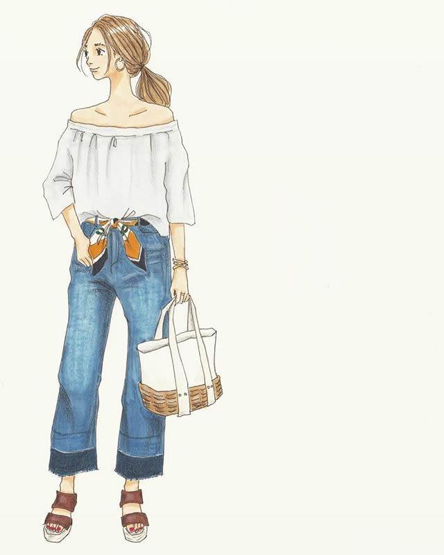 这次分享的是一款性感的一字肩上衣,大方展现出漂亮的肩颈线条和锁骨,能够帮助你凸显出性感的魅力。下半身搭配一条高收腰的牛仔裤,腰间用印花丝巾点缀收腰,将甜美与休闲的风格融合,是不错的混搭风,帮助你演绎出一种不经意的美感。