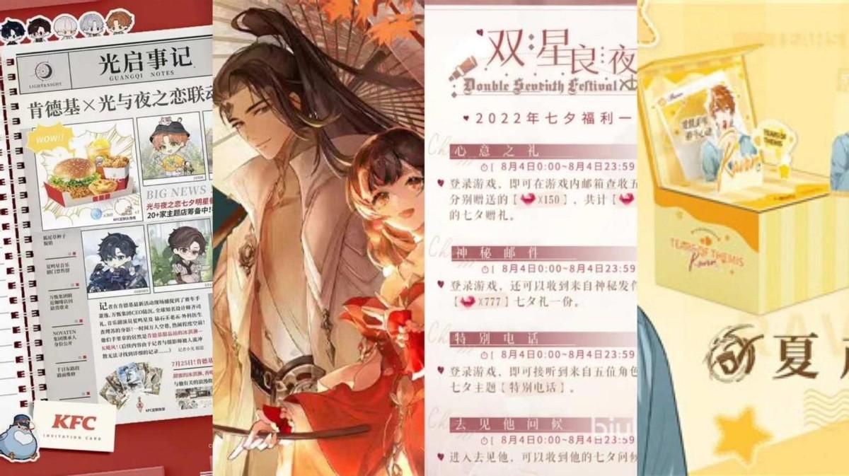 例如《倩女幽魂》手游与花西子的联合活动、《恋与制作人》推出相关周边、《光与夜之恋》与肯德基联名、《未定事件簿》推出定制食品礼盒等等……厂商们都在用各种形式,为产品自身在七夕的热度添柴。