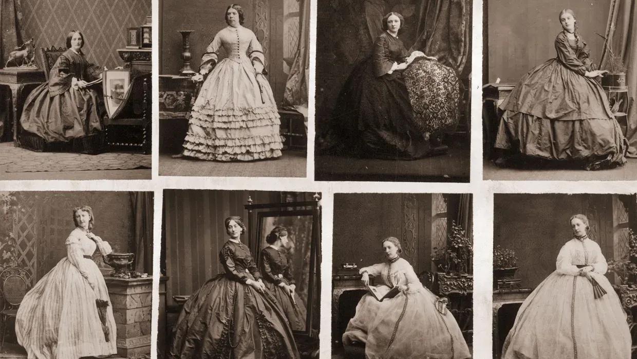 这是一系列描绘维多利亚时代穿着衬裙的妇女的照片,拍摄于1860年左右。