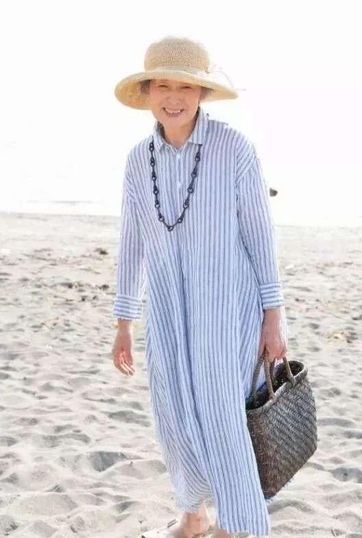 相比起纵向的条纹,横向条纹更适用于连衣裙当中,比如衬衫裙、针织裙、西装裙等等,融入了纵向条纹之后,在视觉上更显身高优势。宽松有度的长裙穿上身放松又慵懒,对于70多岁的奶奶辈来说是不错的选择,在色彩的挑选上尽量以浅色系为主,比如白色和浅蓝色的组合,对于条纹元素更有优势。