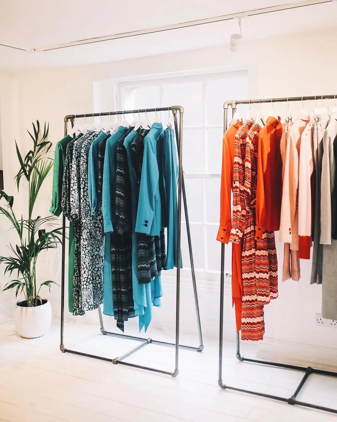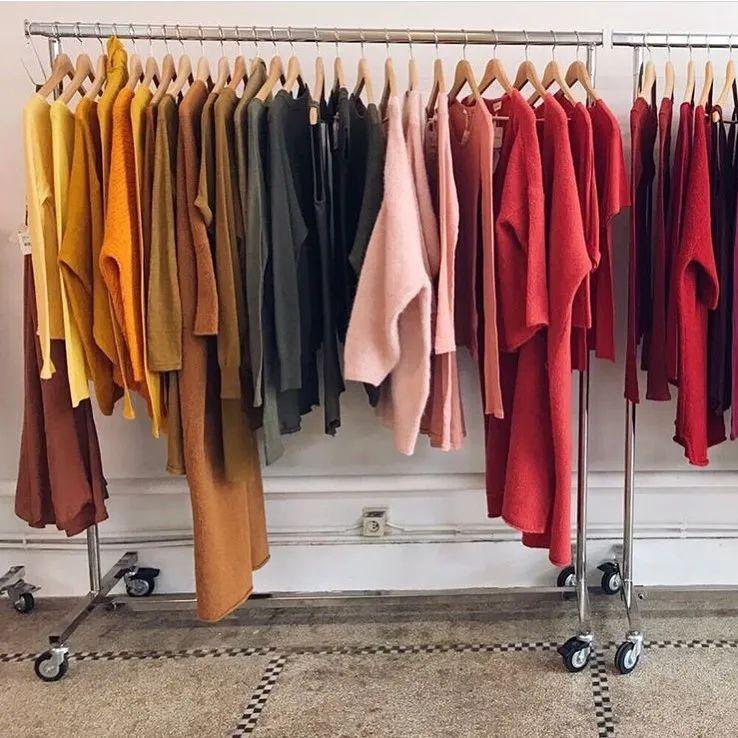 渐变法:是按照色相环来进行色彩渐变陈列形式,主要分为色相渐变、纯度渐变、明度渐变等等,运用渐变法陈列后服装的系列感会加强。