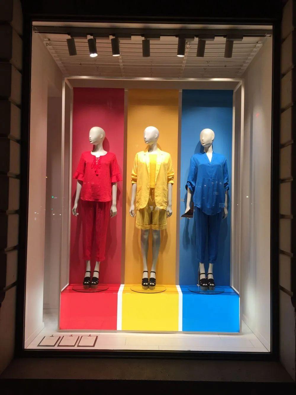 色彩具有诱目性,以前跟大家分享过,橱窗好不要用黑白色,因为黑白色橱窗进店率不高,而越是醒目的色彩,如美术三原色—红、黄、蓝,能快速地吸引到顾客的视线。
