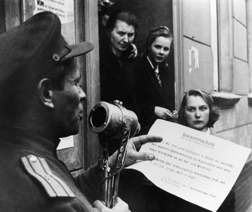 1945年5月,一名苏军少校军衔向民众宣读了德军在柏林投降的文本。