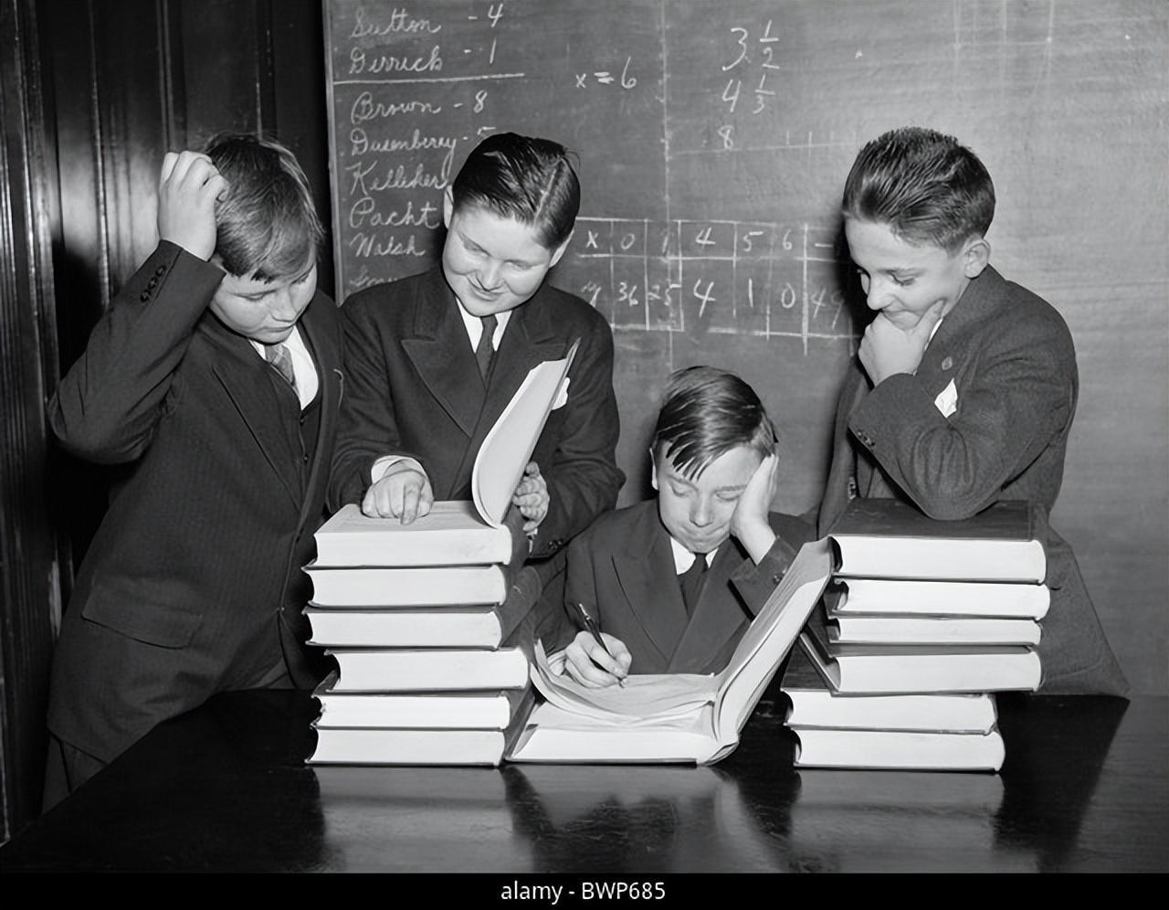 1936年的复古照片,一群男孩在华盛顿特区的一间教室里学习书籍。