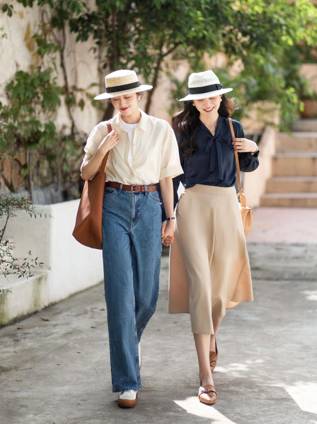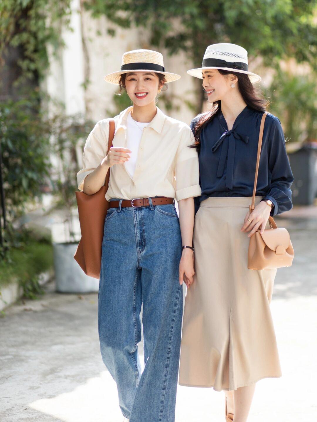 LOOK5:短袖衬衫+牛仔裤;藏蓝色衬衫+半身裙。