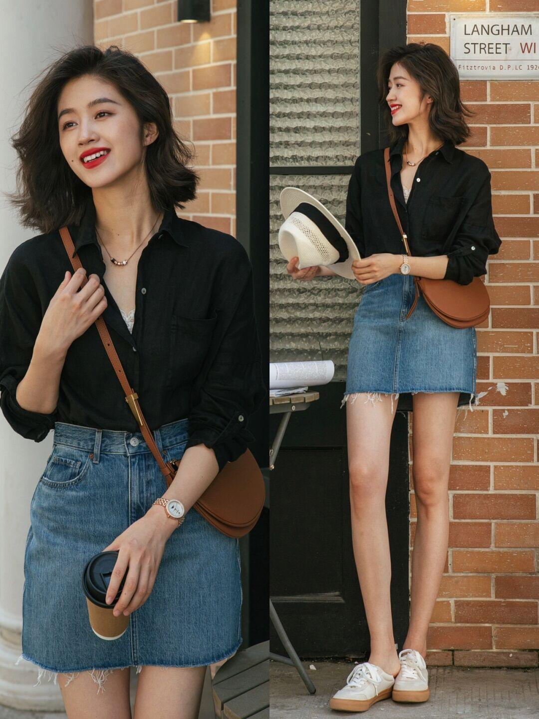 LOOK6:黑色衬衫+牛仔短裙。