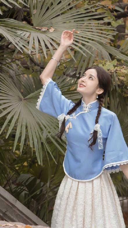 除了旗袍造型,早前网上就有爆出过娜扎的民国学生装扮,不同于成熟优雅的旗袍照,学生装扮的娜扎更显清纯甜美,梳着两尾麻花辫子,皮肤白皙嫩滑,穿着蓝色的民国学生校服,搭配刺绣白长裙和黑布鞋,活像是民国穿越而来的天真女学生。