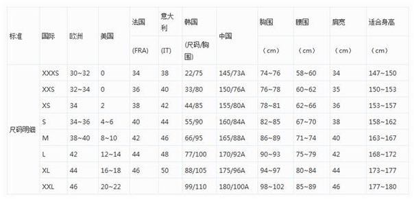 咱们先来说女装,这里所指的上装包括t恤,衬衫,毛衫,风衣,羽绒服,连衣裙等款式,给大家po一张各国的尺码对照图