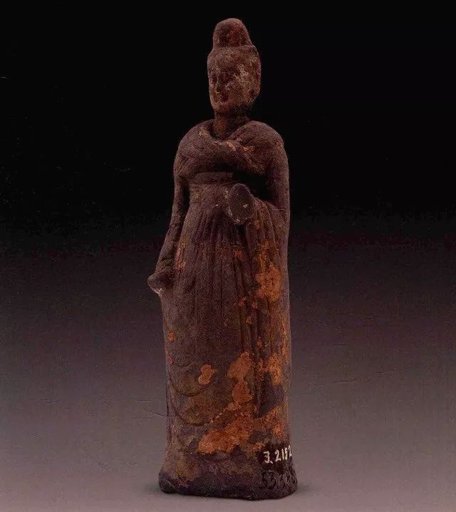 上图是北魏名臣杨机的墓中,身着阔袖高腰襦裙的双髻女俑。