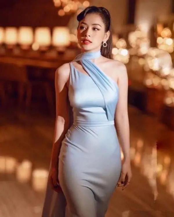 丝缎蓝色自带天蓝色的神秘和减龄果,清新可人,搭配半肩吊带配束腰设计,一根丝带让整个礼服显得风情万种。