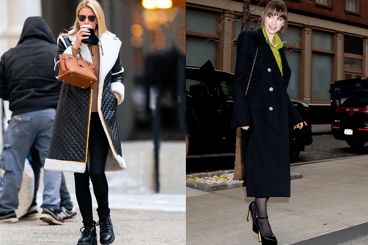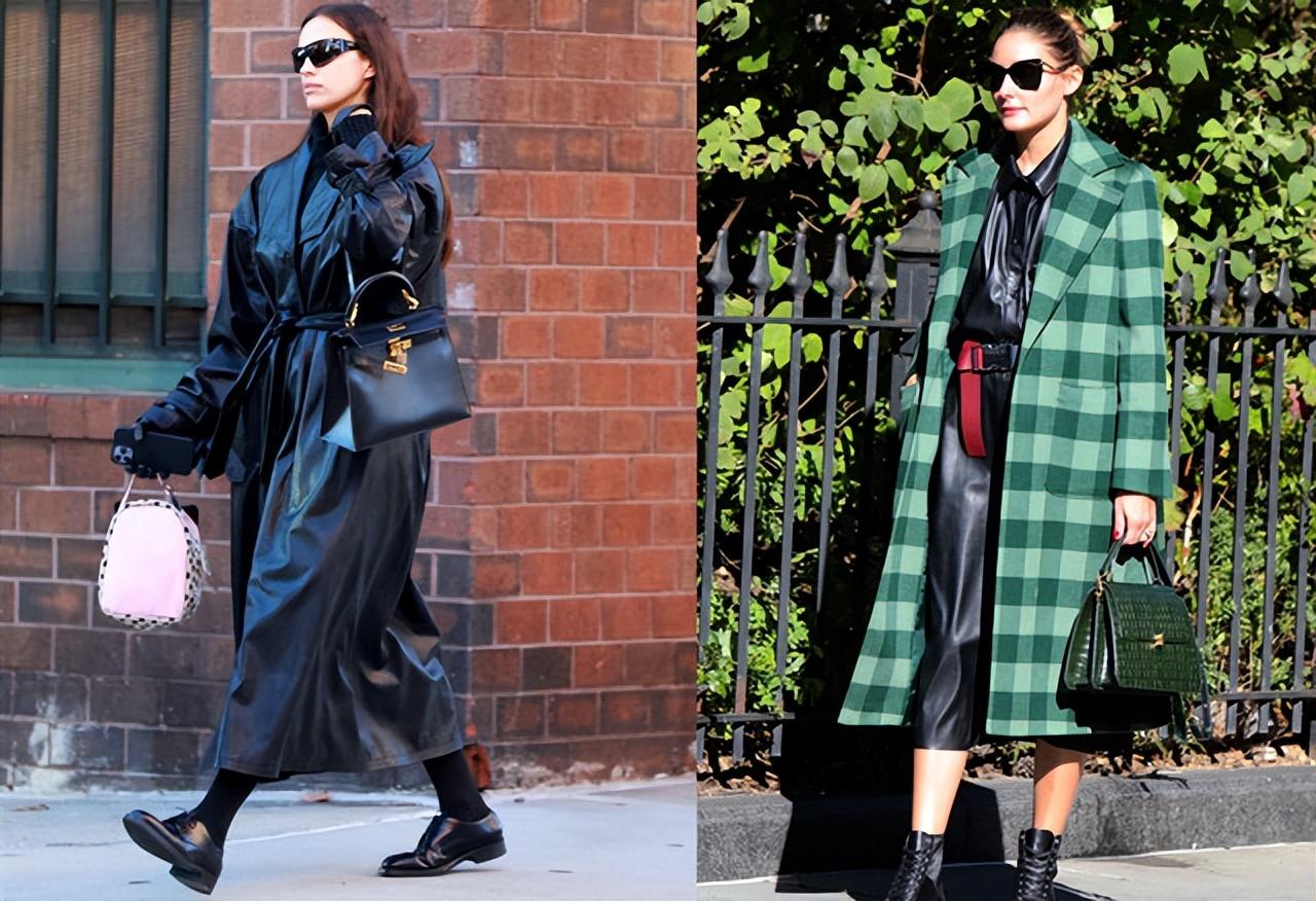 左图:伊琳娜谢克,享受冬季全黑是时尚风格,一件挡风的oversized漆皮外套,内搭高领针织衫。如果是一身黑色,厚实的黑色连袜裤,会给人一种时尚的印象。
