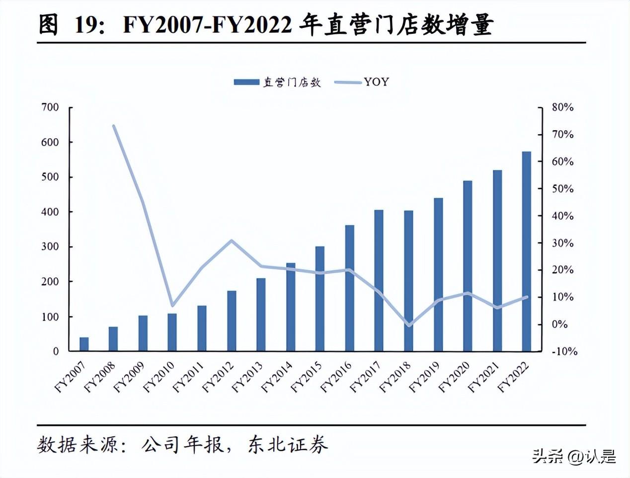 2018 年-至今,稳健扩张期:随着公司改革的深化,品牌度再次恢复。2018 年营收增速,股价开始上涨,至 今 3 年股价翻近 2 倍,2021 财年毛利率上涨至 55.98%。 1)产品升级:品类端:2019 年公司面向女性消费者推出运动员个护产品,2022 年公司持续扩大品类,3 月进军鞋履市场,7 月推出户外运动产品。产品端:不 断进行面料研发(如:Nulux 冰染技术)和技术创新(如:Enlite 运动内衣系 列),其产品的功能性和舒适性广受消费者好评,在业内建立了极高的品牌技术 壁垒。 2)市场扩张:公司加速化布局,巩固北美地区的同时,扩张欧洲地区和亚 太地区。其中战略核心为美国、中国、英国三个地区的扩张,2018 年三个 线下直营门店数量为 274/15/9 家,截至 FY2022Q1 门店数量升至 325/87/18 家。 3)营销策略:公司开展 KOL 大使计划,与当地运动行业大使、明星、社群健 身教练等知名人物合作,进行口碑宣传。2020 年公司与加拿大新闻基金会和广 播公司开展合作,扩大品牌宣传力度。2021 年宣篮球运动员乔丹·克拉克森成 为品牌大使。