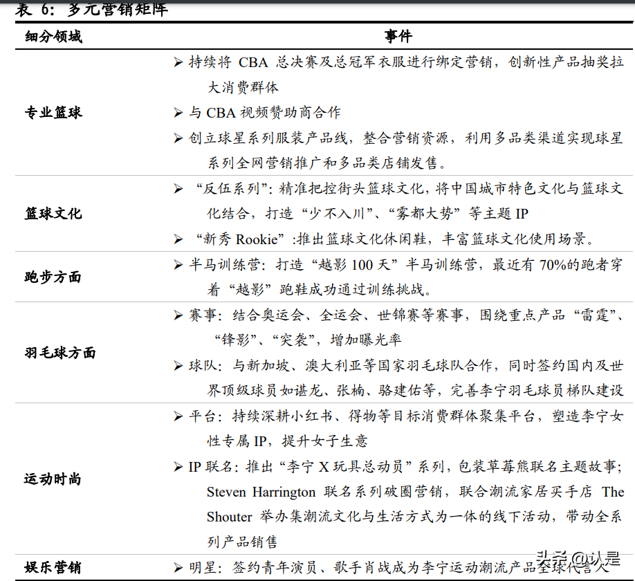 营销端:多渠道营销。1)竞技体育代言人:1999 年签约孔令辉,是早开启体 育明星代言的本土品牌;2007 年陆续签约斯科拉、加内特、 隆多、张继科、刘 诗雯、汤普森、谷爱凌等。2)流量明星代言人:签约王一博,玩转粉丝经济。 3)多项体育赛事,强化品牌认知。