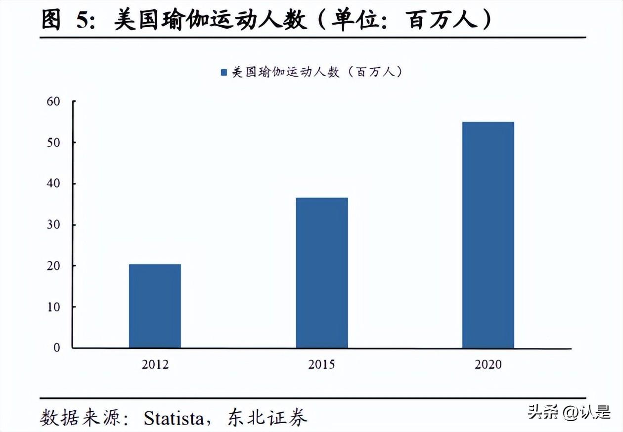随着“她经济”崛起,更多女性追求精神享受、健康消费,瑜伽作为一种时尚的健 身方式广受女性群体欢迎。瑜伽的缘起可追溯至古印度文化,通过运动呼吸使人的 身体、意识、精神凝聚合一,后传入美国得以流行。目前已成为现代繁忙的都市生 活中流行的运动之一。 根据 Statista 数据库统计, 2012-2020 年美国瑜伽运动人数复合增长率为 13.2%,美 国瑜伽行业年收入从 2012 年的 69 亿美元增至 2020 年的 115.6 亿美元,CAGR 为 7%。根据 Eventbrite 和 One Poll 调查发现,通常瑜伽爱好者一生中平均花费 6.26 万 美元在瑜伽相关消费上,其中瑜伽课程开销占比46%,瑜伽设备和服饰开销占比54% 左右。 Lululemon 成功塑造“瑜伽第一联想品牌”的品牌形象。Lululemon 是先布局瑜 伽专业服饰的品牌之一,创始人 Wilson 早期预见行业的长期发展性,仅凭“一条瑜 伽裤”站稳女性运动消费市场。随后凭借其产品的功能性和时尚度,成功把瑜伽服 从瑜伽馆引至街头时尚的潮流,成为运动鞋服行业性的龙头公司。