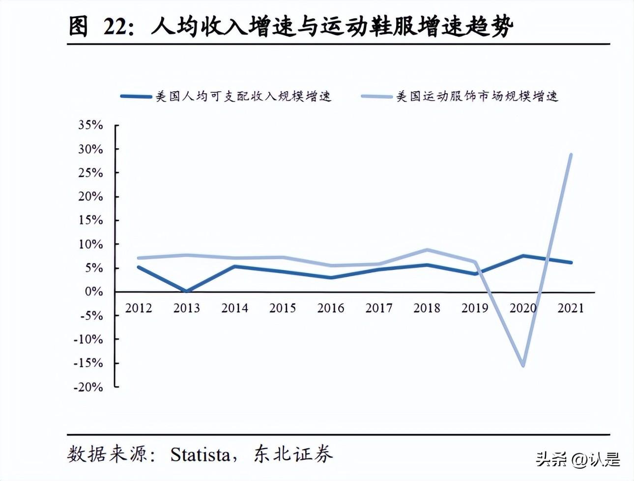 经济发展和消费需求驱动运动服饰行业发展。纵观美国百年运动史,美国运动服饰 市场收入增速与美国人均可支配收入增速趋势基本一致。随着美国人均可支配收入 的增加,消费结构升级推动运动健身作为一种时尚健康的生活方式迅速崛起。根据 Euromonitor 统计,2010-2019 年美国运动服饰市场规模 CAGR 为 6.87%,2019 年达 到3698.02亿美元。2020年受疫情原因影响美国运动服饰市场规模同比下降22.73%, 2021 年逐步回暖,同比上升 28.80%。 复盘美国运动鞋服市场发展,分为几个阶段:(1)1970s 前(运动萌芽期):当时运 动这一概念逐渐从“专业运动员”、“竞技体育”转向“日常居民”、“健身锻炼”,运 动产品开始普及,主要为海外品牌为主,如阿迪达斯、日本虎牌等。(2)1970s~1990s (运动觉醒期):这一阶段陆续经历了“慢跑热”、“女性运动潮”、“篮球热”、“休闲 时尚热”等,各品牌轮流坐镇。(3)2000 至今(运动成熟期):消费者运动习惯培养 完成。多品牌并购完成,双强多超的竞争格局逐渐清晰,Nike 和 Adidas 形成具备广 度和深度的综合龙头品牌。 目前已形成稳定的竞争格局,强者恒强。2021 年 Nike 集团在美国的市占率达 16.5%, 维持行业龙头地位,。Adidas 市占率达 6.0%,位居第二。Top2 综合运动 品牌龙头市占率维持在 20%+。随后 UnderArmour、Lululemon、Skechers、VF 等品 牌市占率分别为 4.3%/2.5%/2.5%/2.5%,更聚焦细分赛道的品牌随着消费者偏好、潮 流机遇的变化而起伏。