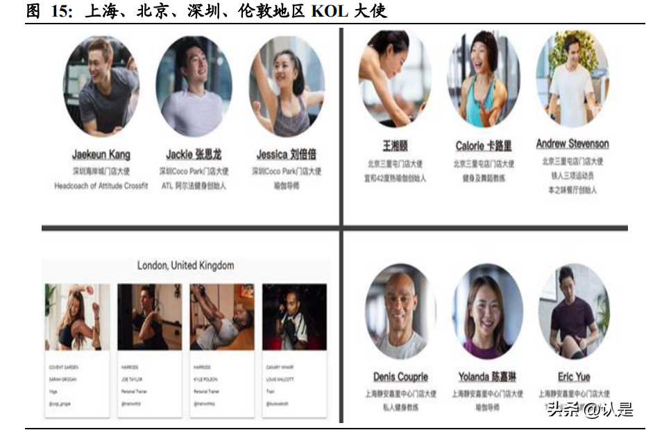 随着公司的性扩张,公司启动线上线下的 KOL 口碑营销。Lululemon 在各 地寻找当地的 KOL 关键意见,包括跑者、教练、运动员、瑜伽练习者、企业家、 艺术家、创新者等当地有影响力的人物等,产生粉丝应扩大用户量。 1)在线下开展体验式营销:公司在各大城市公开举办瑜伽训练,瑜伽趣味活动等, 同时聘请当地有声望的 KOL 大使,吸引当地的瑜伽爱好者,宣传品牌理念,迅速形 成粉丝社群。以进军中国市场初期为例,Lululemon 定期在北京、上海、深圳、西安 等地开展线下集体瑜伽活动,邀请在门店消费的顾客参加活动,活动现场多数为人 流密集的广场,请来当地的运动大使以及瑜伽业内有名望的专业人士,活动现场异 常火爆,吸引大批现场观众,迅速扩大品牌影响力。