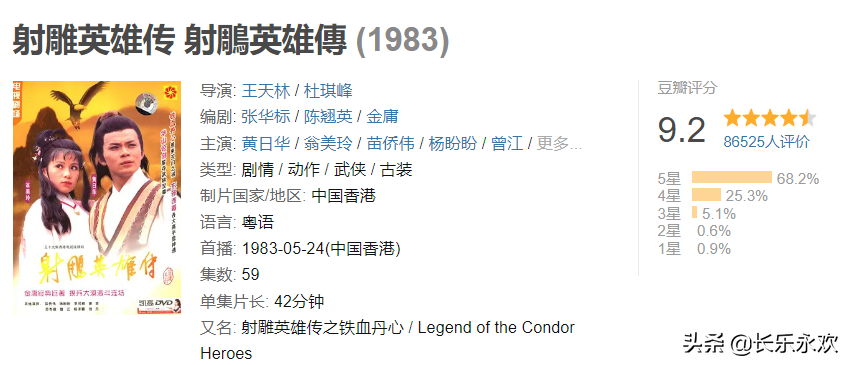 1983年的《射雕英雄传》作为经典中的经典版,在电视还很稀缺的年代依然有着高的收视率,更是被人深刻熟记的一版。尤其是主题曲《铁血丹心》流传至今又不过时,可见受欢迎程度。