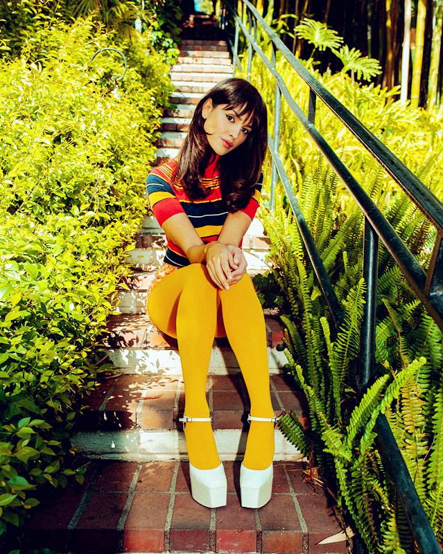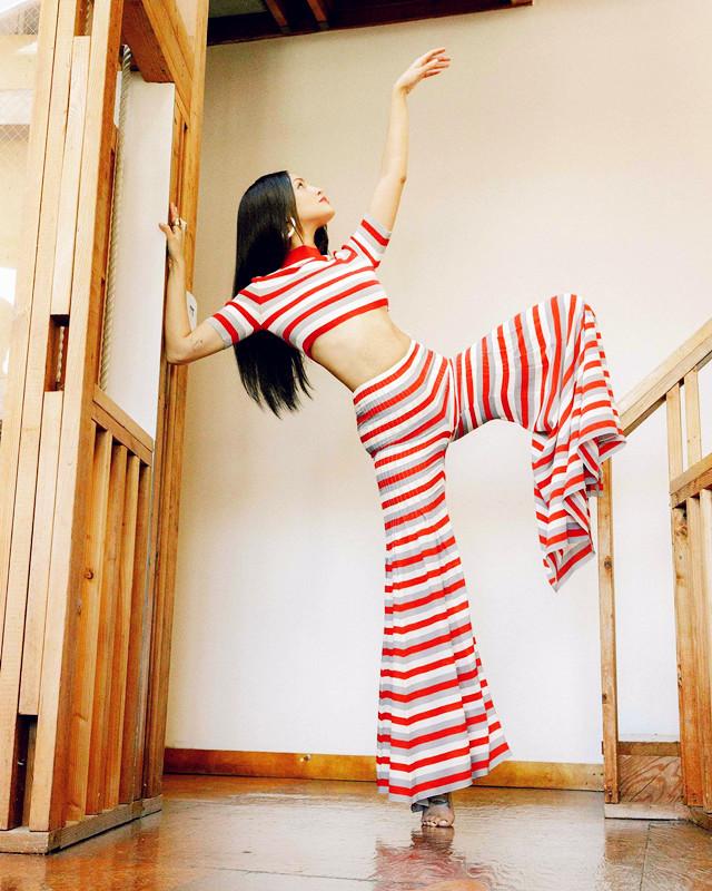钟爱红色,青睐条纹,高领短衫配低腰条纹裤,这就是美洲一绝。