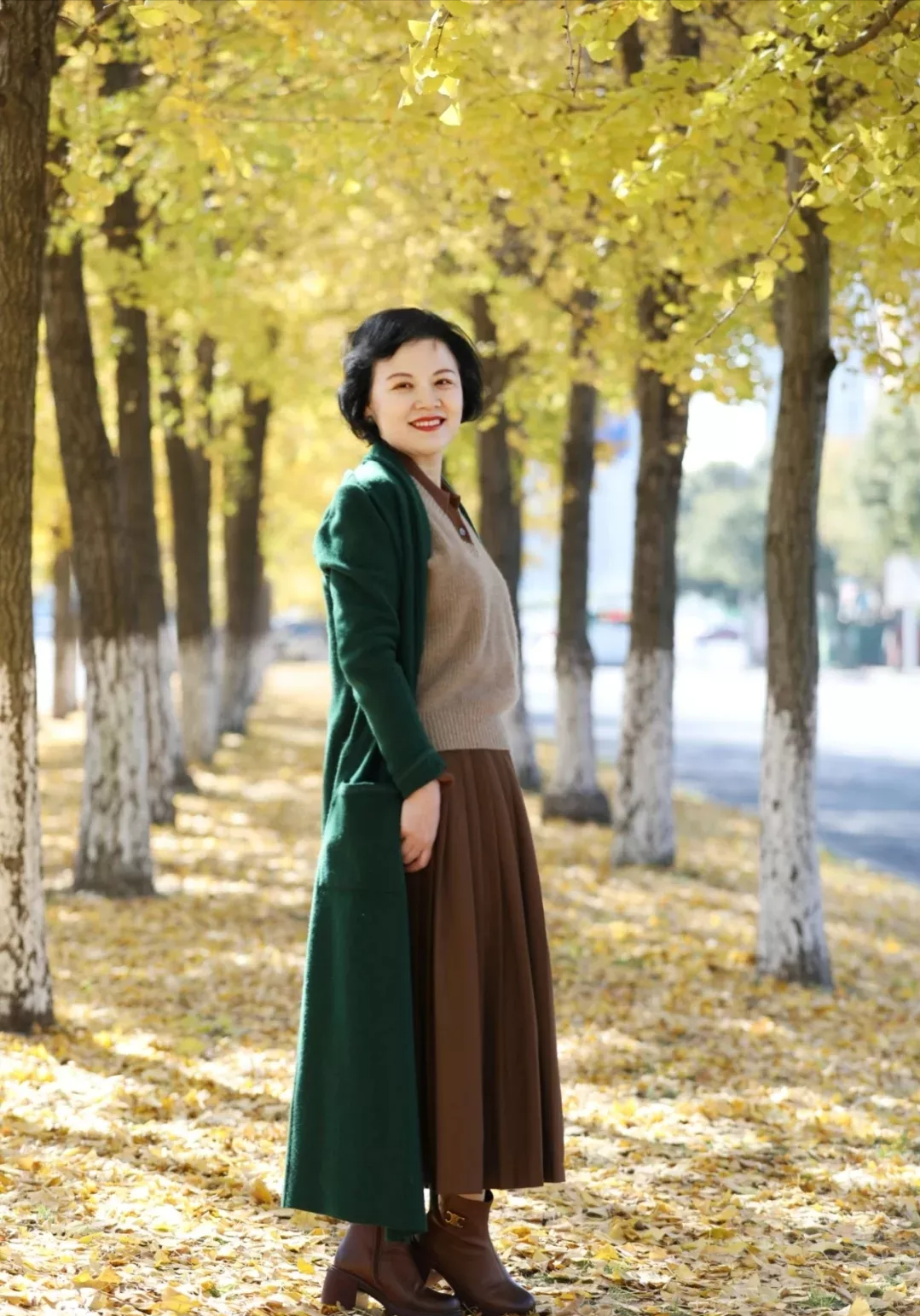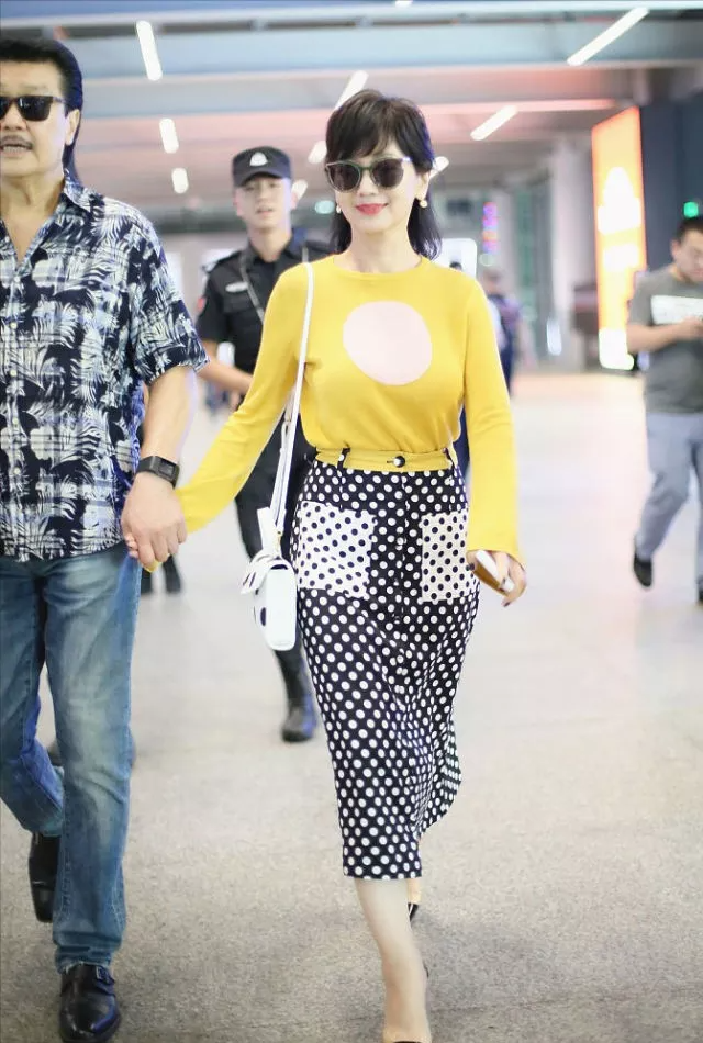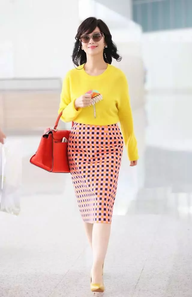 塞衣角是为了突出腰线,同样地,上短下长的穿法也有同样的果。当我们下半身穿着的裙子长度超过膝盖的时候,上半身的毛衣就一定要选择短款,尤其是小个子妈妈们。这样搭配不仅可以塑造良好的身材比例,也显干净利落,谁穿谁就是时髦精。