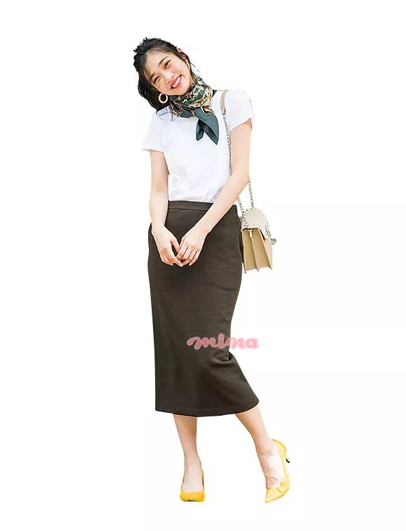 清爽的白色T恤搭配今年大热的橄榄色长裙,沉稳的色彩让人在办公室也能优雅穿着。