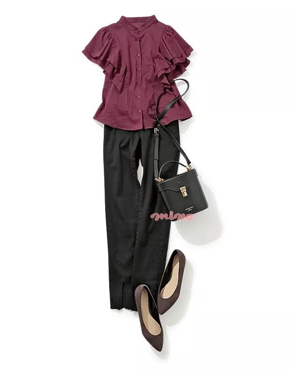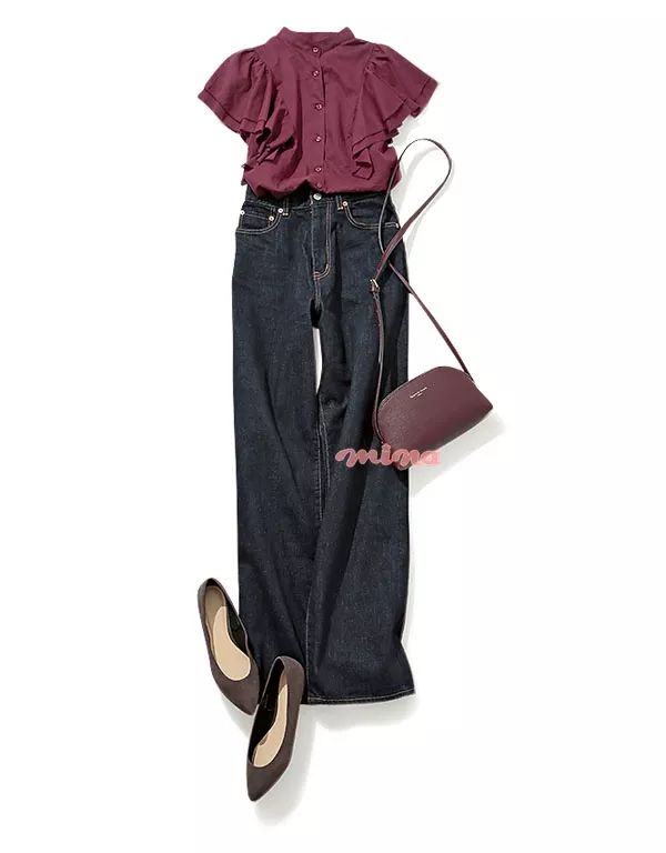 高领和荷叶袖的设计时髦度加分。酒红色尽显优雅女人味,搭配休闲阔腿裤显瘦增高。