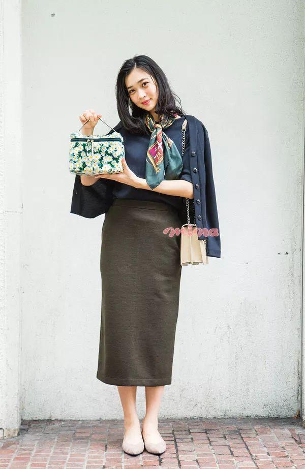 日常的通勤装扮略显沉闷单调,把丝巾系在包包上彰显时髦功力。