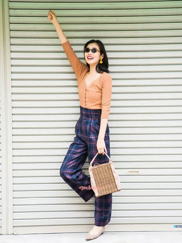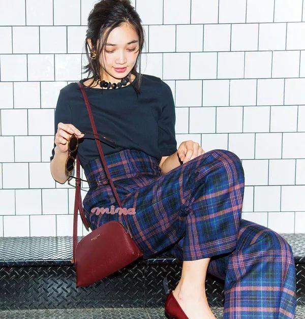 休闲格纹裤用红色小物和大耳环搭配,打造出约会感造型。