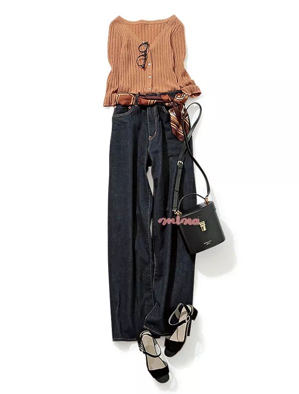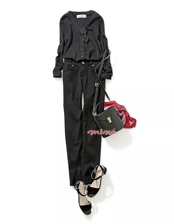 因为是下班后和朋友有约,将同色调的开衫搭在肩头是关键。