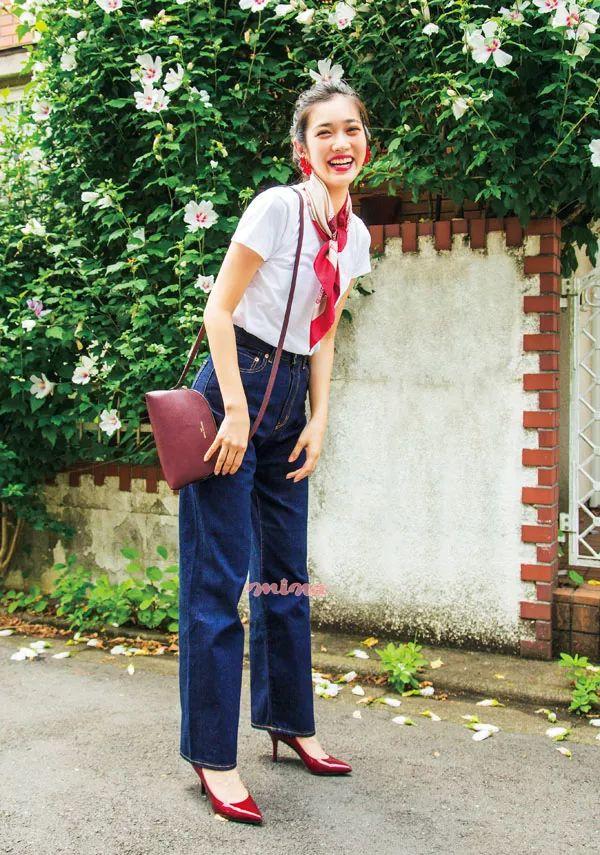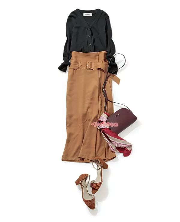 搭配一双酒红色的高跟鞋时髦亮眼。脖子上的丝巾尽显温柔优雅。