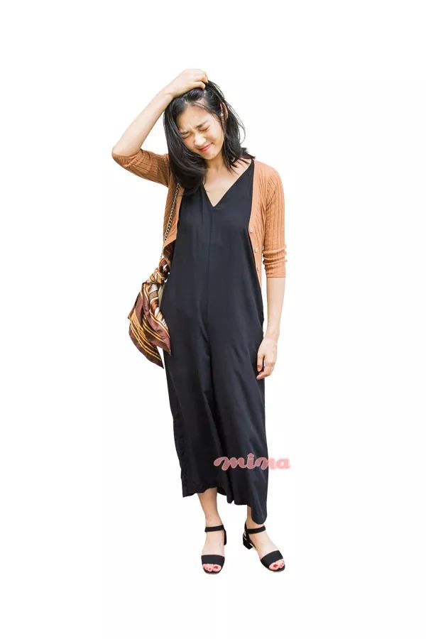 单穿或叠穿都ok的薄款针织衫。质感轻薄的黑色连体裤显瘦时髦。